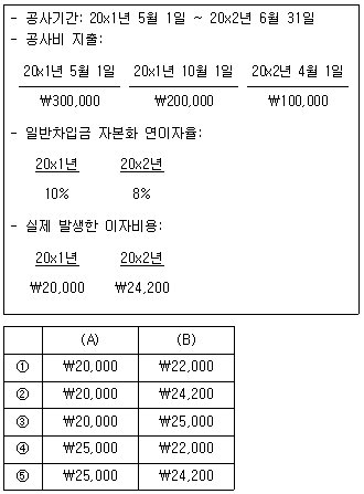 (주)감평은 특정차입금 없이 일반차입금을 사용하여 건물을 신축하였다. 건물은 차입원가 자본화 대상인 적격자산이다. 신축 건물과 관련한 자료가 다음과 같을 경우, 20x1년도에 자본화할 차입원가(A)와 20x2년도에 자본화할 차입원가(B)는? (단, 계산시 월할 계산하며, 전기에 자본화한 차입원가는 적격자산의 연평균 지출액 계산 시 포함하지 않는다.)