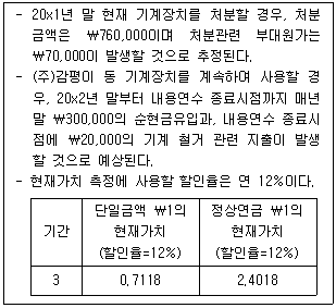 (주)감평은 20x1년 초 기계장치(취득원가 ₩1,600,000, 내용연수 4년, 잔존가치 ₩0, 정액법 상각)를 취득하였다. (주)감평은 기계장치에 대해 원가모형을 적용한다. 20x1년 말 동 기계장치에 손상징후가 존재하여 회수가능액을 결정하기 위해 다음과 같은 정보를 수집하였다.