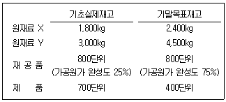 (주)감평은 단일제품을 생산ㆍ판매하고 있으며, 시장수요예측에 근거하여 당기에 21,000단위의 제품을 판매할 계획이다. 원재료 X는 공정 초에 전량 투입(제품 단위당 2kg 투입)되고 원재료 Y는 공정의 50 %시점에 전량 투입(제품 단위당 3kg 투입)되며, 가공원가는 공정 전반에 걸쳐 균등하게 발생한다. 당기 초 실제재고와 당기 말 목표재고는 다음과 같다.