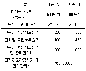 (주)감평의 20×1년도 제품 A와 B에 대한 생산ㆍ판매 자료는 다음과 같다.