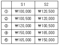 두 개의 보조부문(S1, S2)으로부터 제조부문 P1과 P2에 배분된 금액이 각각 ₩142,500과 ₩78,000인 경우, 보조부문원가를 배분하기 이전의 보조부문 S1과 S2에 집계된 원가는?