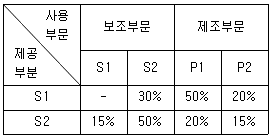 (주)감평은 두 개의 제조부문(P1, P2)과 두 개의 보조부문(S1, S2)을 운영하고 있으며, 상호배분법을 사용하여 보조부문원가를 제조부문에 배분한다. 각 부문 간의 용역수수관계는 다음과 같다.