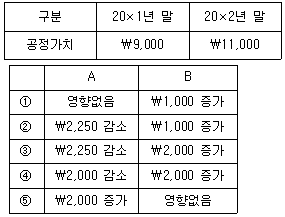 도소매업을 영위하는 (주)감평은 20×1년 초 건물을 취득(취득원가 ₩10,000, 내용연수 5년, 잔존가치 ₩0, 정액법 상각)하였다. 공정가치가 다음과 같을 때, (주)감평이 동 건물을 유형자산으로 분류하고 재평가모형을 적용하였을 경우(A)와 투자부동산으로 분류하고 공정가치모형을 적용한 경우(B), 20×2년 당기순이익에 미치는 영향은?
