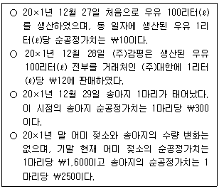 20×1년 초 설립된 (주)감평은 우유생산을 위하여 20×1년 2월 1일 어미 젖소 2마리(1마리당 순공정가치 ₩1,500)를 1마리당 ₩1,500에 취득하였으며, 관련 자료는 다음과 같다.
