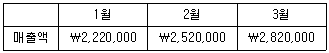 20x1년 초 영업을 개시한 상품매매기업인 (주)감평의 20x1년 1분기 월별 매출액 예산은 다음과 같다.