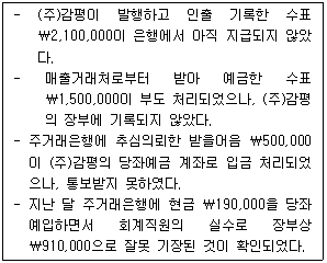 (주)감평은 20x1년 12월 31일 주거래은행으로부터 당좌예금잔액증명서상 잔액이 ₩7,810,000이라는 통지를 받았으나, 회사의 12월 31일 현재 총계정원장상 당좌예금 잔액과 불일치하였다. (주)감평이 이러한 불일치의 원인을 조사한 결과 다음과 같은 사항을 발견하였다. 이들 자료를 활용하여 (주)감평의 수정 전 당좌예금계정 잔액(A)과 수정 후 재무상태표에 당좌예금으로 계상할 금액(B)은?