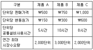 (주)감평은 세 종류의 제품 A, B, C를 독점 생산 및 판매하고 있다. 제품생산을 위해 사용되는 공통설비의 연간 사용시간은 총 40,000시간으로 제한되어 있다. 20x1년도 예상 자료는 다음과 같다. 다음 설명 중 옳은 것은?