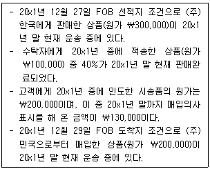20x1년 말 현재 (주)감평의 외부감사 전 재무상태표 상 재고자산은 ₩1,000,000이다. (주)감평은 실지재고조사법을 사용하여 창고에 있는 상품만을 기말재고로 보고하였다. 회계감사 중 공인회계사는 (주)감평의 기말 재고자산과 관련하여 다음 사항을 알게 되었다.