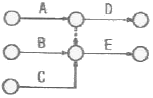 다음 그림의 AOA(Activity-on-Arc) 네트워크에서 E작업을 시작하려면 어떤 작업들이 완료되어야 하는가?