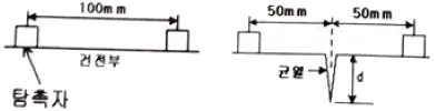 아래 그림과 같은 조건에서 탄성파법에 의해 측정한 균열깊이(d)는 얼마인가? (단, Tc-To법을 사용하며, 측정한 Tc=250μs, To=120μs이고, Tc는 균열을 사이에 두고 측정한 전파시간, To는 건전부 표면에서의 전파시간을 나타낸다.)