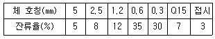 잔골재를 체가름하였더니 각 체에 남은 잔류율(질량백분율)은 아래의 표와 같았다. 이 잔골재의 조립율은?