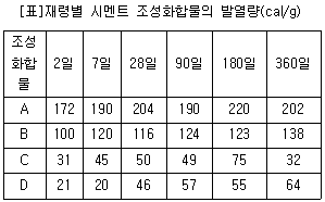 아래의 표는 재령별 시멘트 조성화합물의 발열량(cal/g)의 예를 나타낸 것이다. 조성 화합물 A에 가장 적합한 것은?