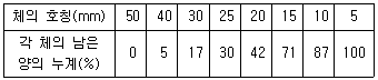굵은 골재의 체가름을 하여 다음 표와 같은 결과를 얻었다. 이 골재의 조립률은 얼마인가?