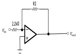 다음 회로에서 전압 이득이 –100이 되기 위한 R2값은 얼마인가?