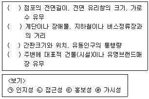 점포개설과정에서 입지조건을 평가하는 대표적 항목들을 예시한 것이다. 아래 <보기>에서 해당하는 특성을 찾아 순서대로 바르게 제시한 것은?