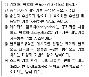 아래 글상자에서 전자상거래 보안을 위한 비밀키 암호방식의 특징을 모두 나열한 것으로 가장 옳은 것은?