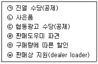 아래 글상자의 유통판매촉진 유형 중 가격판촉만을 나열한 것으로 가장 옳은 것은?
