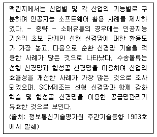 아래 글상자는 인공지능(AI) 기술이 유통·물류 서비스 분야에 접목된 사례를 분석하여 제시하고 있다. 인공지능 기술과 관련된 용어와 설명으로 가장 옳지 않은 것은?