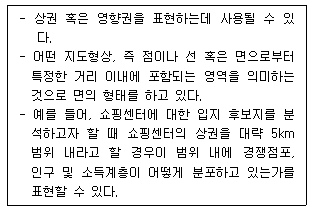 입지의사결정과 상권분석은 물론 gCRM에 이르기까지 활용도가 넓어지고 있는 지리정보시스템(Geographic Information System)의 주요 기능 중에서 아래 글상자가 설명하는 내용으로 가장 옳은 것은?