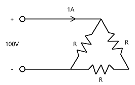 그림과 같이 동일한 저항을 삼각형으로 접속하여 100[V]를 가할 때 1[A]의 전류가 흐른다면 저항 R의 값은?