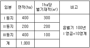 지위가 다른 3개 임분의 면적과 벌기재적이 <보기>와 같을 때 이에 대한 설명으로 가장 옳지 않은 것은?