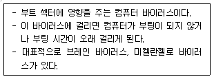 컴퓨터 전원을 켜면 디스크에 저장되어 있는 운영체제를 메모리에 로드한다. 이러한 과정을 부팅이라고 하는데, 부팅 정보를 가지고 있는 디스크 영역을 부트 섹터라고 한다. 다음 설명하는 바이러스 종류는 무엇인가?