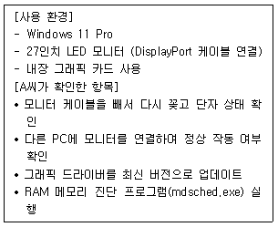 중견기업에 근무하는 IT 부서 A씨는 영업팀 직원으로부터 "모니터 화면에 색상이 이상하게 나오고 세로로 줄이 생긴다"는 민원을 받았다. A씨는 현장에 방문하여 다음과 같이 점검을 진행하였다. 다음 중 A씨가 확인한 항목에 대한 설명으로 옳지 않은 것은?