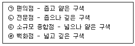 소매상은 점포 특성에 맞게 상품구색의 폭(좁음, 넓음)과 깊이(얕음, 깊음)를 결정해야 한다. 아래 글상자에서 소매점 유형과 상품구색을 타당하게 연결한 항목만을 모두 옳게 고른 것은?
