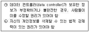최근 개인정보보호 문제가 중요한 이슈로 대두되고 있다. 아래 글상자는 하버드 대학교 버크만 센터에서 제시한 개인정보보호 AI윤리원칙이다. ㉠과 ㉡에 해당하는 각각의 권리로 가장 옳은 것은?