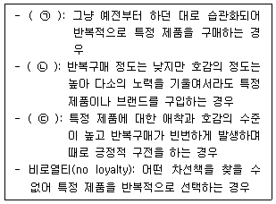 아래 글상자는 로열티(고객충성도)의 유형을 설명하고 있다. ㉠, ㉡, ㉢에 들어갈 용어를 순서대로 나열한 것으로 옳은 것은?