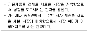 앤소프(Ansoff, H. I.)의 성장전략 중 아래 글상자에서 설명하는 전략으로 가장 옳은 것은?