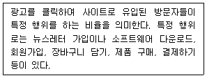 49 다음 중 제품수명주기에 따른 유통전략으로 가장 옳지 않은 것은? 50 아래 글상자의 괄호 안에 들어갈 용어로 가장 옳은 것은? 51 브랜드 인지와 관련하여 자사제품의 브랜드를 가장 먼저 떠올린 응답자가 전체 중 어느 정도인지 의미하는 용어로 가장 옳은 것은? 52 다음 중 단품관리의 기대효과로 가장 옳지 않은 것은? 53 고객이 온라인 서비스에 접속한 후 상품을 구매하기까지의 과정을 단계별로 나누어 깔때기 모양으로 시각화한 고객구매여정모델로서 옳은 것은? 54 다음 중 고객 심리와 행동에 의해 형성된 가격과 관련된 용어의 설명으로 가장 옳지 않은 것은? 55 촉진관리를 위한 마케팅 커뮤니케이션 수단들에 대한 아래의 설명 중에서 옳지 않은 것은? 56 아래 글상자의 내용을 의미하는 용어로 가장 옳은 것은? 57 소비재는 일반적으로 편의품, 선매품 그리고 전문품으로 구분된다. 전문품에 대한 설명으로 가장 옳은 것은? 58 다음 중 특정 상품에 대한 관심과 사용에 기반하여 사회적 관계를 맺고 있는 소비자집단으로 가장 옳은 것은? 59 미디어 믹스에 대해 설명한 아래 글상자의 ㉠과 ㉡에 해당하는 용어의 짝으로서 옳은 것은? 60 아래 글상자의 괄호에 공통적으로 들어갈 디지털 마케팅에서의 성과지표로 가장 옳은 것은?