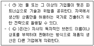 아래 글상자에서 설명하는 기업이 글로벌 시장에서 경쟁하기 위한 전략을 괄호 안에 들어갈 순서대로 옳게 나열한 것은?