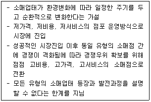 아래 글상자가 공통적으로 설명하는 소매상의 변천과정가설 및 이론으로 가장 옳은 것은?