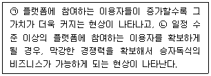 아래 글상자에서 설명하는 플랫폼 비즈니스의 두 가지 핵심 특성과 관련한 현상을 순서대로 바르게 나열한 것은?