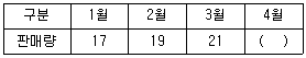 단순 이동평균법을 이용하여 아래 표의 ( )안에 들어갈 판매예측치를 계산한 것으로 옳은 것은? (단, 이동평균기간은 2개월로 함)