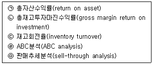 아래 글상자의 성과측정 지표들 중 머천다이징에서 상품관리 성과를 측정하기 위한 지표들만을 나열한 것으로 옳은 것은?