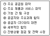 아래 글상자의 구매 관련 공급자 개발 7단계 접근법이 옳은 순서로 나열된 것은?