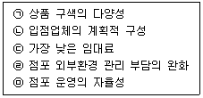 아래 글상자의 항목 가운데 쇼핑몰 입지의 장점들만을 모두 포함한 내용으로 가장 옳은 것은?