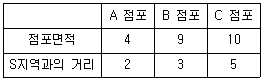 S지역에 거주하는 소비자들이 이용할 수 있는 점포가 3개만 존재한다. 다음 자료와 Huff모델을 사용하여 소비자들의 이용 확률이 가장 높은 점포와 그 확률을 구한 것으로 옳은 것은? (단, 소비자들의 점포면적에 대한 민감도는 +2, 거리에 대한 민감도는 –2이다.)