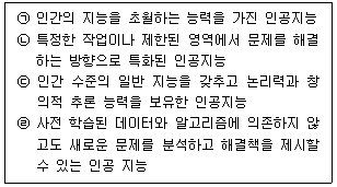 AI는 고도화 수준에 따라 '제한적 인공지능(ANI)', '범용 인공지능(AGI)', '초인공지능(ASI)'으로 구분할 수 있다. 아래 글상자의 내용 중 AGI에 해당되는 설명을 모두 나열한 것은?
