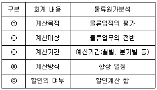 아래 글상자에서 회계 내용과 물류원가분석의 특징으로 가장 옳지 않은 것은?
