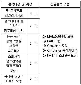 아래 글상자의 왼쪽에는 다양한 상권분석 기법들의 특성이 정리되어 있다. 이들 특성과 관련된 상권분석 기법들을 순서대로 정리한 것으로 가장 옳은 것은?