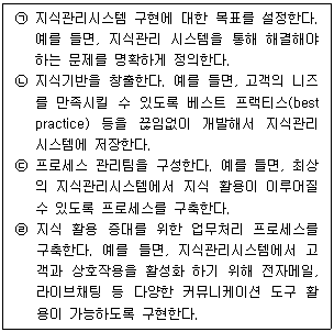 아래 글상자에서 제시하는 지식관리 시스템 구현 절차를 순서대로 바르게 나열한 것으로 가장 옳은 것은?