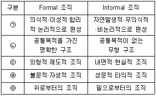 Formal 조직과 Informal 조직의 특징비교 설명으로 옳지 않은 것은?
