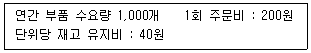 아래 글상자에 제시된 내용을 활용하여 경제적주문량을 고려한 연간 총재고비용을 구하라. (기준 : 총재고비용 = 주문비 + 재고유지비)