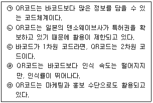 아래 글상자에서 QR코드에 대한 설명으로 옳지 않은 것만을 나열한 것은?