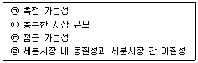 아래 글상자에서 효과적인 시장세분화 조건으로 옳은 것 만을 모두 나열한 것은?