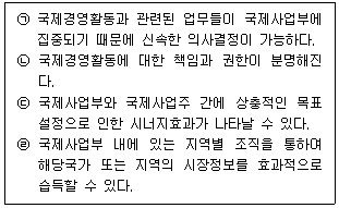 아래 글상자의 내용 중 국제기업 조직 관련 국제사업부의 장점 설명으로 옳은 것을 모두 고르면?