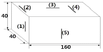 그림과 같이 주강품에 결함이 5개 있다. 길이방향으로 축통전법을 적용할 때 확실하게 자분모양을 얻을 수 있는 지시는?